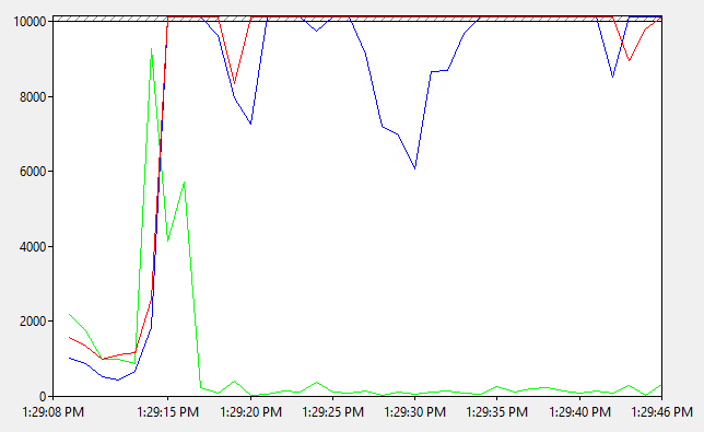 And within no time at all it did happen again, all too soon. So I opened up PerfMon and I immediately noted a number of spikes reaching well over the threshold limits that in my configuration were set to 5000 and I knew exactly what time to concentrate on when looking for more clues.